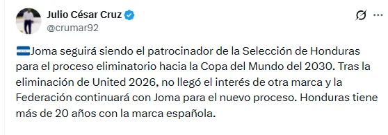 “Joma seguirá siendo el patrocinador de la Selección de Honduras para el proceso eliminatorio hacia la Copa del Mundo 2030. Tras la eliminación de United 2026, no llegó el interés de otra marca y la Federación continuará con Joma para el nuevo proceso. Honduras tiene más de 20 años con la marca española”, escribió Cruz en su cuenta de X.