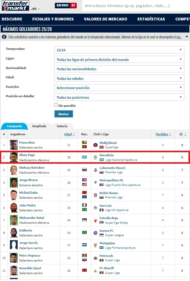 En sus registros dictan que Vega lleva 8 goles y ha dado una asistencia con el Marathón, equipo que disfruta de su año de centenario. Todo esto a pesar de no ser delantero centro.