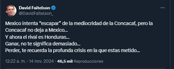 “México intenta “escapar” de la mediocridad de la Concacaf, pero la Concacaf no deja a México. Y ahora el rival es Honduras. Ganar, no te significa demasiado. Perder, te recuerda la profunda crisis en la que estas metido”, aseveró David Faitelson en sus redes sociales.