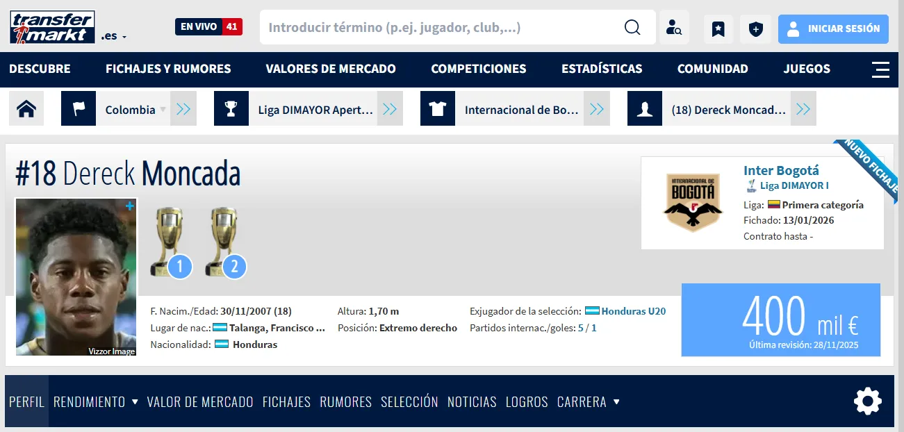 La última revisión realizada por Transfermarkt revela que ahora el precio de Dereck Moncada es de 400 mil dólares, costo que, de mantener su nivel, sin duda incrementará en los próximos meses.