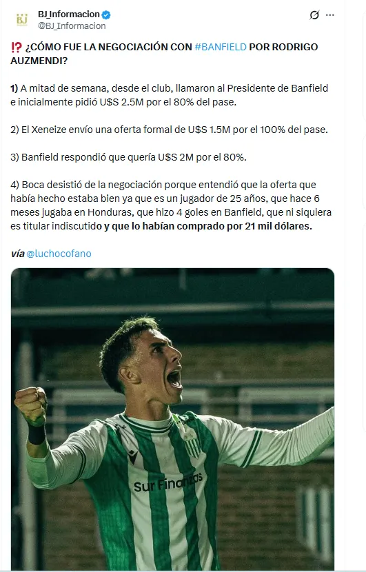 El reporte indica a mitad de la semana anterior llamaron al presidente de Banfield, quien solicitó 2.5 millones de dólares por el 80% del pase de Rodrigo Auzmendi. Ante eso, Boca envió una contrapropuesta de 1.5 millones de dólares por el 100%.