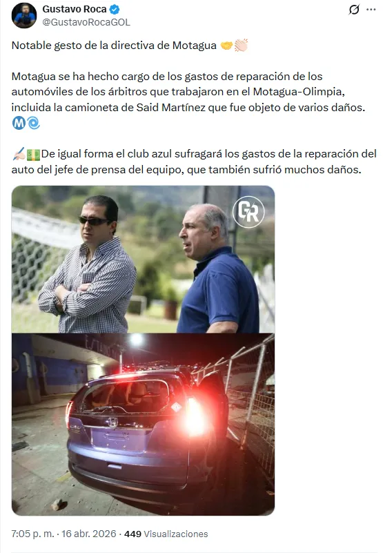 “Notable gesto de la directiva de Motagua. Motagua se ha hecho cargo de los gastos de reparación de los automóviles de los árbitros que trabajaron en el Motagua-Olimpia, incluida la camioneta de Said Martínez que fue objeto de varios daños”, escribió Roca en su cuenta de X.
