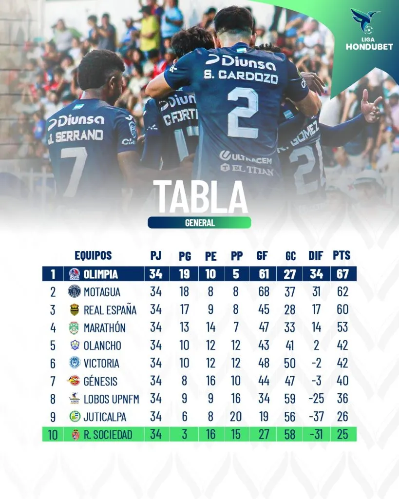 Dicho tercer lugar le pertenece ya de manera permanente al Real España de Jeaustin Campos que con 60 puntos ya es inalcanzable para Marathón.