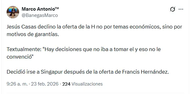 “Jesús Casas declinó la oferta de la H no por temas económicos, sino por motivos de garantías. ‘Hay decisiones que no iba a tomar él y eso no le convenció’. Decidió irse a Singapur después de la oferta de Francis Hernández”, escribió Banegas.