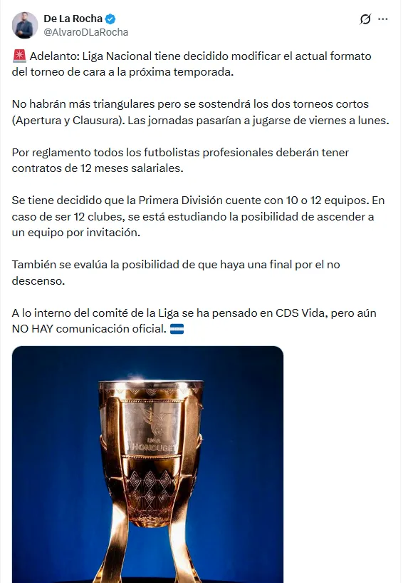 El periodista Álvaro de la Rocha adelantó que las autoridades del fútbol catracho modificarán el formato del torneo; aunque se mantendrán los dos torneos cortos: Apertura y Clausura.