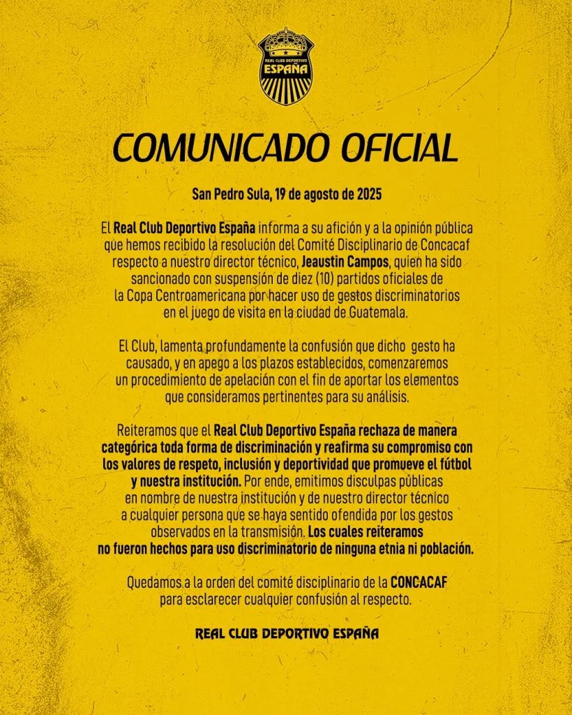“El Real Club Deportivo España informa a su afición y a la opinión pública que hemos recibido la resolución del Comité Disciplinario de Concacafa respecto a nuestro director técnico Jeaustin Campos, quien ha sido sancionado con suspensión de diez (10) partidos oficiales de la Copa Centroamericana por hacer uso de gestos discriminatorios en el juego de visita en la ciudad de Guatemala.
