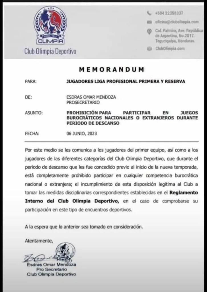 ”Por este medio se les comunica a los jugadores del primer equipo, así como a los jugadores de las diferentes categorías del Club Olimpia Deportivo, que durante el periodo de descanso que les fue concedido previo al inicio de la nueva temporada, está completamente prohibido participar en cualquier competencia burocrática nacional o extranjero”, se cita en el documento.