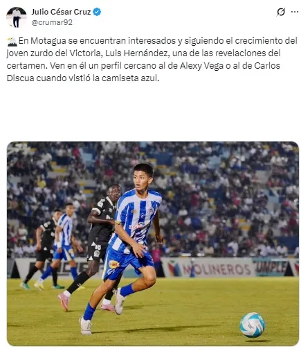 “En Motagua están interesados y siguiendo el crecimiento del joven zurdo del Victoria, Luis Hernández, una de las revelaciones del certamen. Ven en él un perfil cercano al de Alexy Vega o al de Carlos Discua cuando vistió la camiseta azul”, asegura Cruz.