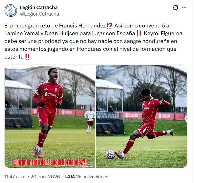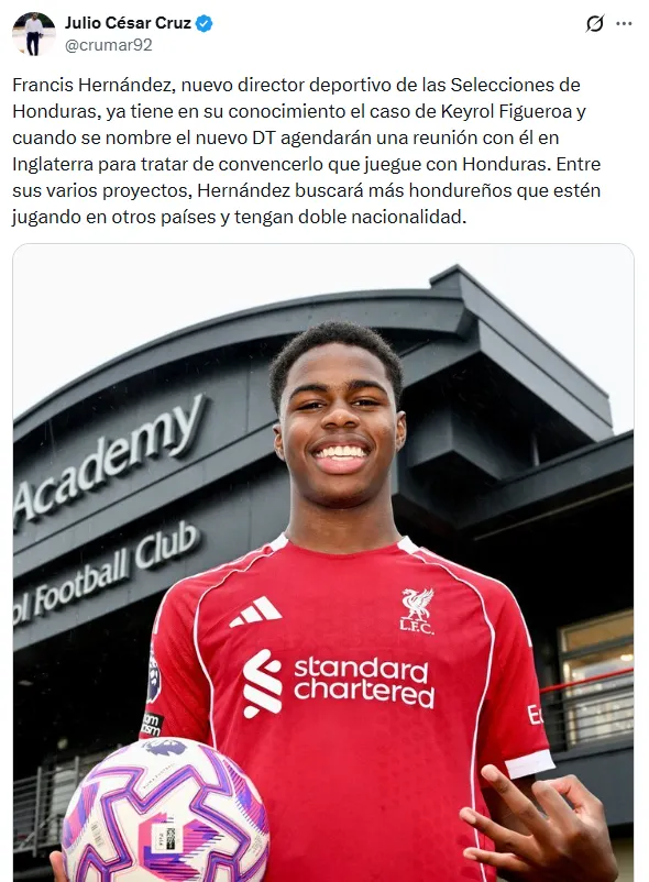 “El primer gran reto de Francis Hernandez. Así como convenció a Lamine Yamal y Dean Huijsen para jugar con España: Keyrol Figueroa debe ser una prioridad ya que no hay nadie con sangre hondureña en estos momentos jugando en Honduras con el nivel de formación que ostenta”, escribió.