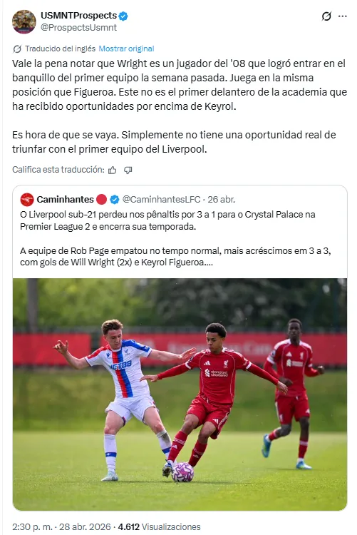 “Vale la pena notar que Wrigth es un jugador del 2008 que logró entrar en el banquillo del primer equipo la semana pasada. Juega en la misma posición que Figueroa. Este no es el primer delantero de la academia que ha recibido oportunidades por encima de Keyrol”, resaltó USMNT Prospects.
