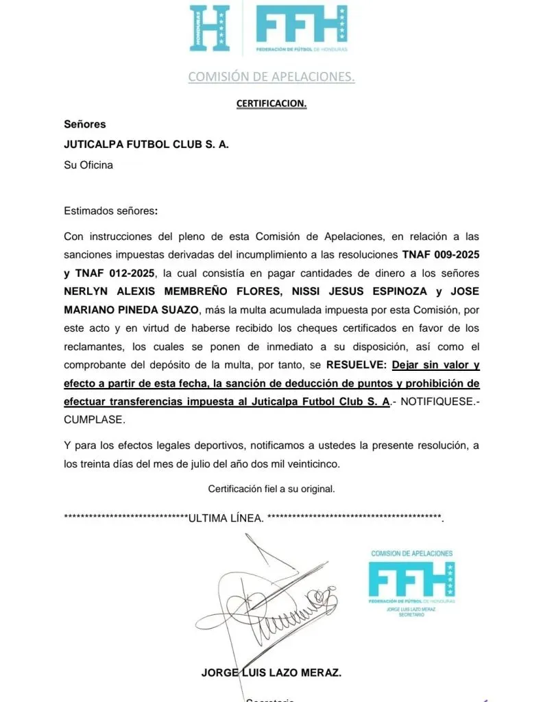 El comunicado de la Comisión de Apelaciones de la FFH es contundente: “Dejar sin valor y efecto a partir de esta fecha, la sanción de deducción de puntos y prohibición de efectuar transferencias impuestas la Juticalpa FC”.