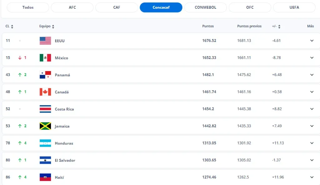 La Selección de Panamá (43) se ubica en el primer lugar de Centroamérica con un total de 1482.1 puntos en total luego de lo que fue su participación en la Copa América 2024.