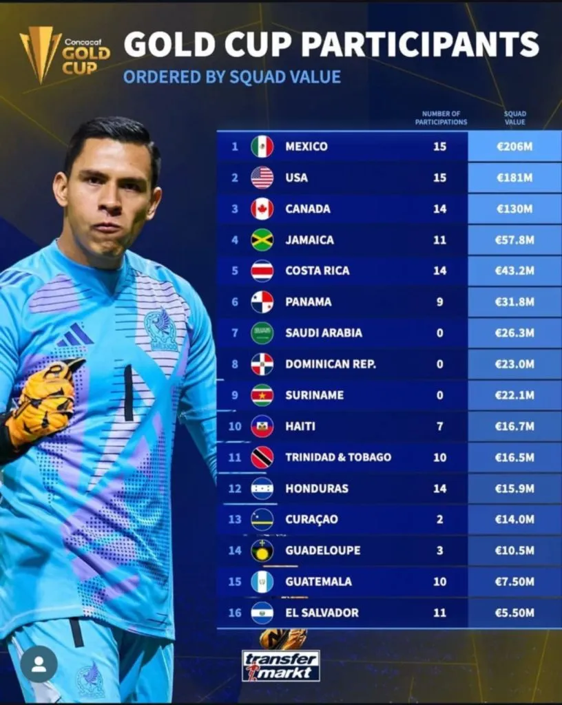 Por encima de los dirigidos por el Bolillo, están equipos como Guatemala (7.5), Guadalupe (10.5), Curazao (14) y su rival en la presente jornada de la Copa.