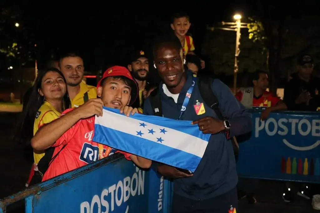 Castillo, 34, junto a sus compañeros se acercaron a saludar, firmar y tomarse fotos con los hinchas del Pereira y fue ahí dónde uno le regaló la bandera de Honduras al artillero.