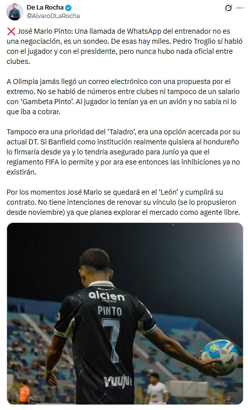 El periodista Álvaro de la Rocha precisó que Olimpia le ofreció a Pinto una renovación desde noviembre; pero el futbolista rechazó la propuesta y podría salir del club en los próximos meses una vez finalizado el Clausura 2026 de la Liga Nacional de Honduras.