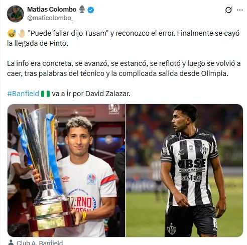 “Puede fallar dijo Tusam” y reconozco el error. Finalmente se cayó la llegada de Pinto”, escribió el comunicador en su cuenta de X.