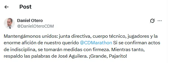 “Mantengámonos unidos: junta directiva, cuerpo técnico, jugadores y la enome afición de nuestro querido Marathón. Si se confirman actos de insdisciplina, se tomarán medidas con firmeza. Mientras tanto, respaldo las palabras de José Aguilera. ¡Grande, pajarito!”, escribió Otero en su cuenta de X.