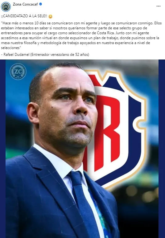 Ahora se da a conocer que Dudamel está en el radar de Costa Rica: “Hace más o menos 10 días se comunicaron con mi agente y luego se comunicaron conmigo. Ellos estaban interesados en saber si nosotros queríamos formar parte de ese selecto grupo de entrenadores para ocupar el cargo como seleccionador de Costa Rica. Junto con mi agente accedimos a esa reunión virtual en donde expusimos un plan de trabajo, donde pusimos sobre la mesa nuestra filosofía y metodología de trabajo apoyados en nuestra experiencia a nivel de selecciones”, fue lo que confirmó el propio DT.
