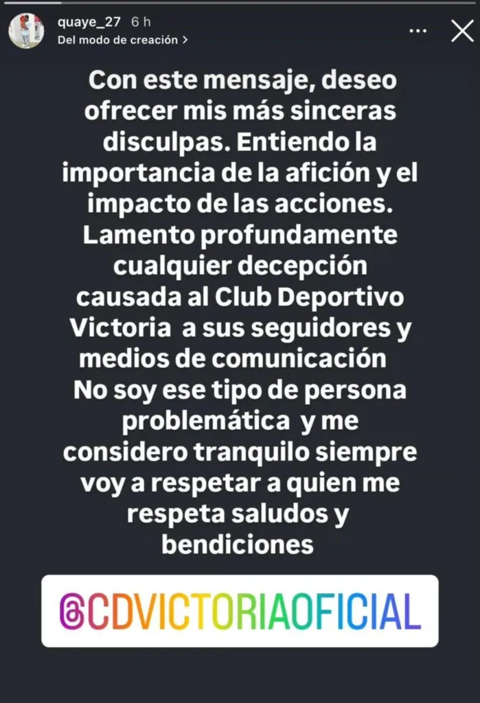 “Con este mensaje, deseo ofrecer mis más sinceras disculpas. Entiendo la importancia de la afición y el impacto de las acciones. Lamento profundamente cualquier decepción causada al Club Deportivo Victoria, a sus seguidores y medios de comunicación. No soy ese tipo de persona problemática y me considero tranquilo y siempre voy a respetar a quien me respeta, saludos y bendiciones”.