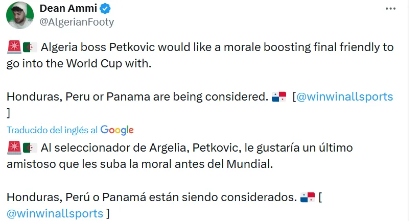 Además de Panamá, Argelia también analiza otras opciones como Honduras o Perú, quienes no estarán en la justa mundialista. El equipo argelino viene de propinarle una humillante goleada a la Selección de Guatemala por 7-0 el pasado 27 de marzo.