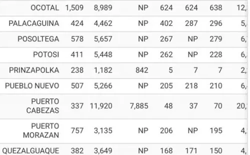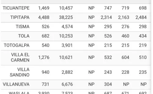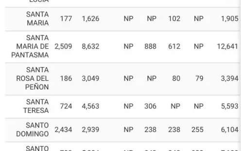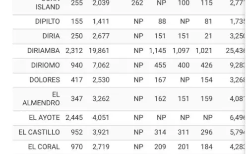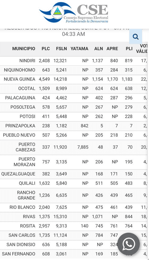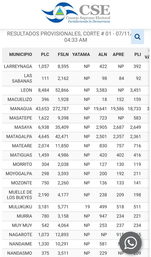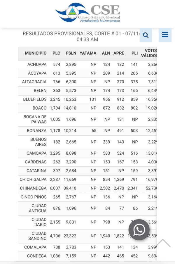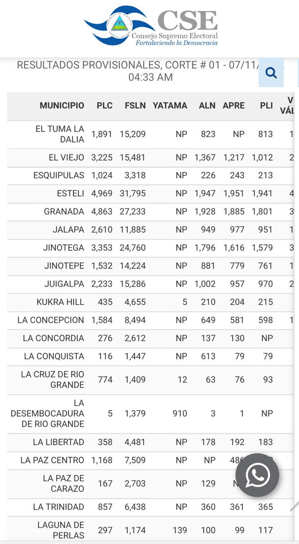 Datos del primer corte realizado a las 4:33AM de estelunes 7 de noviembre con resultados parciales, con municipios ordenandos alfabéticamente