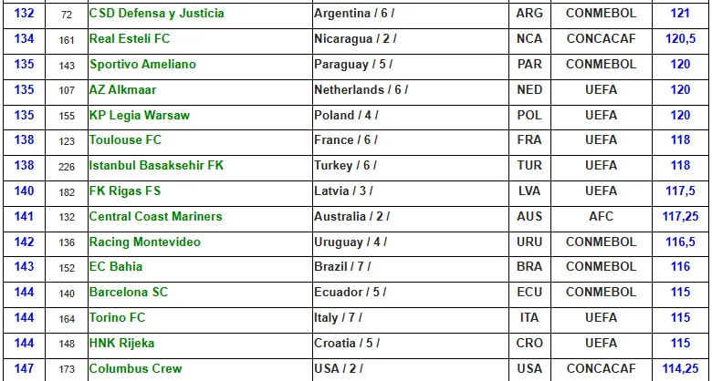 Los registros de la IFFHS (Federación Internacional de Historia y Estadística de Fútbol) dieron a conocer que el Real Estelí de Nicaragua se ubica en la posición número 134. Mientras que el Columbus Crew en el puesto número 147.