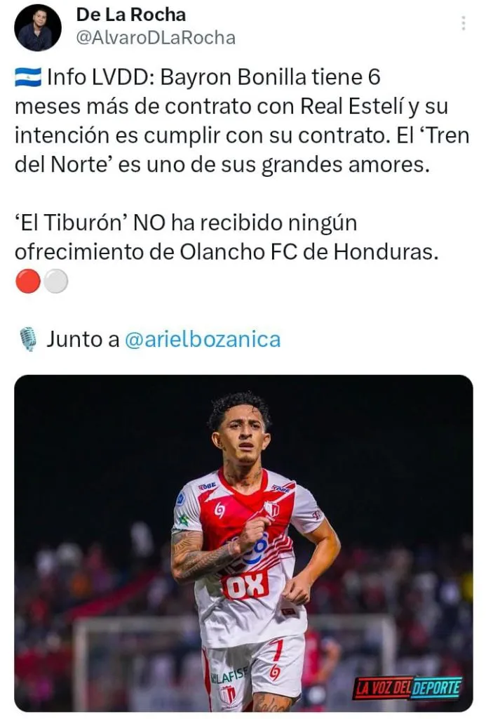 El periodista Álvaro De La Rocha confirmó a través de “X” que Byron Bonilla tiene seis meses más de contrato con Real Estelí y su intención es cumplirlo. Es decir, en el segundo semestre de 2025 se sentará a negociar, abriéndole una interesante puerta a Alajuelense y Comunicaciones.