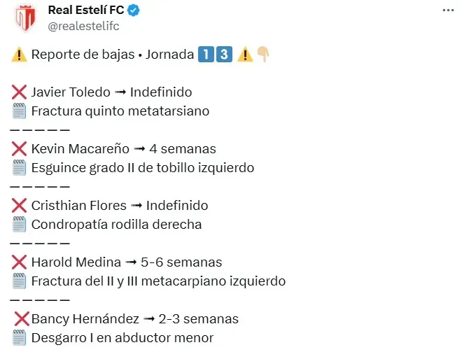 Macareño tiene para cuatro semanas de recuperación por su esguince de grado II en su tobillo izquierdo. Medina deberá recuperarse entre cinco y seis semanas por la fractura del II y III metacarpiano izquierdo. En lo que respecta a Hernández, volverá dentro de tres semanas por un desgarro grado I en el abductor derecho.