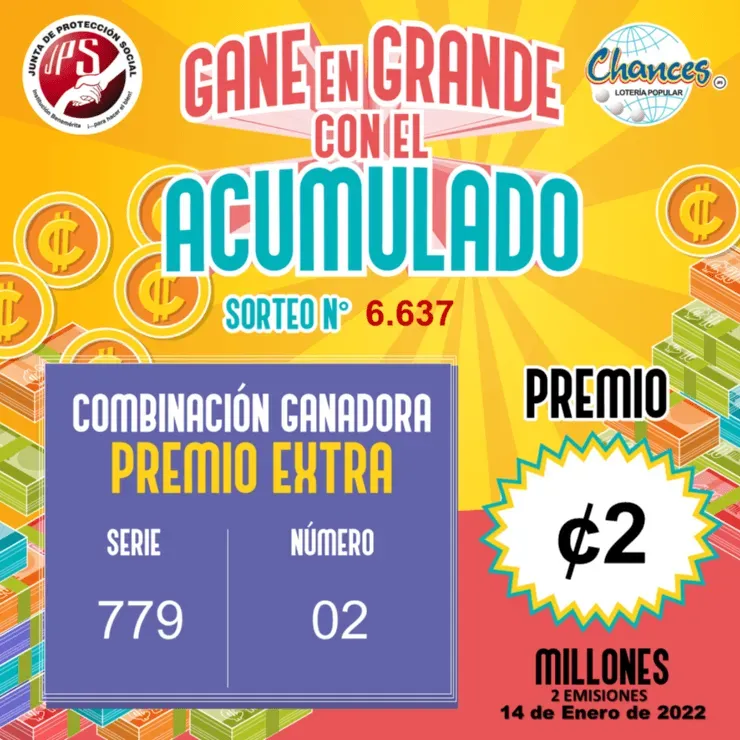 LaLotería Popular “Chances”de la Junta de Protección Social (JPS) tendrá su sorteo número 6637en Costa RicaHOY, viernes 14de enero desde las 19:30(horario local).Los resultados, números ganadores y series serán publicados al final de la nota una vez haya concluídoel mismo.Además,se podrásintonizarlode formaONLINE-y EN VIVO y EN DIRECTO-desde elcanal de YouTube oficial de la JPS.