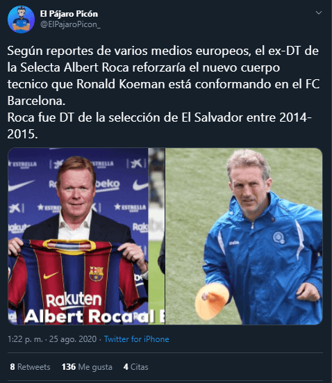 Un ex-entrenador de la selección de El Salvador tiene confirmado su lugar en uno de los equipos más grandes del mundo. Albert Roca, que dirigió a la Selecta entre el 2014 y el 2015, seríaanunciado como nuevo asistente de Ronald Koeman. Una decisión que sorprendió a los medios españoles, pero que es casi un hecho.