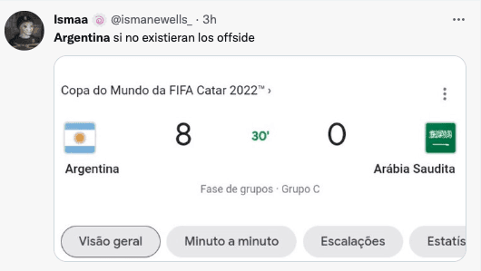 LaSelección de Argentinaprotagonizó una decepción total, luego de que cayera derrotada ante laSelección de Arabia Sauditacon remontada incluida. A pesar de que iniciaron ganando 1-0 con anotación deLionel Messial minuto 10, no supieron mantener su ventaja y en el complemento su rival le dio vuelta al marcador.