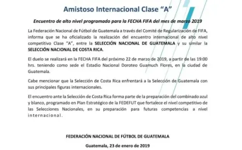 La Federación de Fútbol Guatemalteco (Fedefut) confirmó este miércoles el “encuentro de alto nivel” programado para la Fecha FIFA de marzo, en la que recibirán al portero del Real Madrid: Keylor Navas y a la selección de Costa Rica en el estadio Doroteo Guamuch Flores.