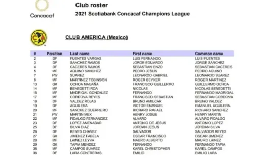 La lista de 23 convocados por el Club América presentados por Santiago Solari ante la Concacaf está compuesta de la siguiente manera: Luis Fuentes, Jorge Sánchez, Sebastián Cáceres, Pedro Aquino, Leonardo Suárez, Roger Martínez, Guillermo Ochoa, Nicolás Benedetti, Fernando Madrigal, Sebastián Córdova, Bruno Valdez, Emanuel Aguilera, Richard Sánchez, Henry Martin, Alvaro Fidalgo,Jesús López, Jordan Silva, Salvdor Reyes, Oscar Jiménez, Mauro Lainez, Fernando Tapia, Karel Campos, Emilio Lara.