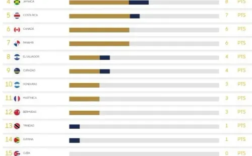 El tercer equipo centroamericano es El Salvador, que aparece justo debajo de los panameños en el octavo lugar con 4 unidades. Cabe recordar que La Selecta venció a Curazao en su debut e igualó frente a Jamaica, pero una goleada 4-0 recibida frente a Honduras la eliminó de su sueño en fase de grupos.