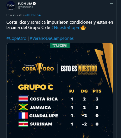 Fue un gran triunfo en el debut del entrenador colombiano Luis Fernando Suárez. Tres puntos muy importantes que sirven para no jugar tan presionado los dos partidos que quedan por la fase de grupos.Los ticos quedan líderes del Grupo C con el mismo puntaje que Jamaica, venció 2-0 a Surinam, pero con mayor diferencia de gol. El próximo partido será ante lossurinameses el viernes a las 18:30 (horario Centroamérica).