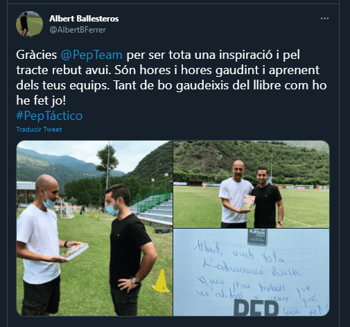 Y para su sorpresa, Pep Guardiola lo recibió de manera presencial y estar un rato con él para conversar de fútbol y de su libro. Además, no podía faltar la histórica foto para el entrenador de las ligas menores de la Liga Deportiva Alajuelense. Sin embargo,Ballesteros negó para La Teja que su forma de jugar o de dirigir sea igual a la de Pep.
