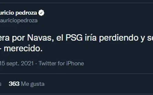 Mauricio Pedroza con una larga trayectoria en el mundo del periodista deportivo, a través de su cuenta de Twitter escribió lo siguiente: “Si no fuera por Navas, el PSG iría perdiendo y sería -ademas- merecido”, y sí, si no hubiese sido por Keylor Navas, los dirigidos por Mauricio Pochettino hubiese comenzado con el pie izquierdo, además de lo que significaría perder con este equipo de estrella ante un rival muy menor en todos los sentidos, sobre todo en estructura, plantilla y económico.