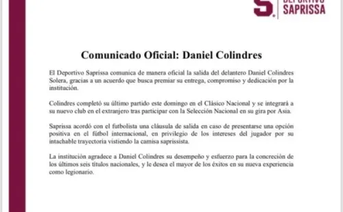 “Saprissa anunció, creo que solo tengo palabras de agradecimiento. Gerencia General y Deportiva, es muy feo decir adiós, es un hasta pronto”, aseguró el ariete, convocado por RonaldGonzález para una gira de partidos frente a Corea del Sur y Japón.
