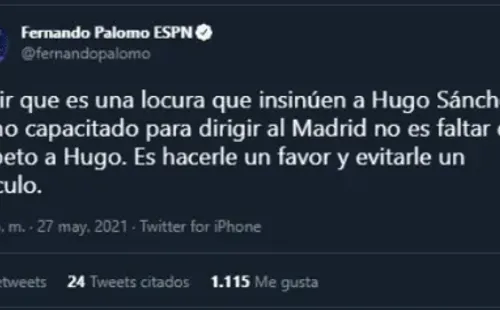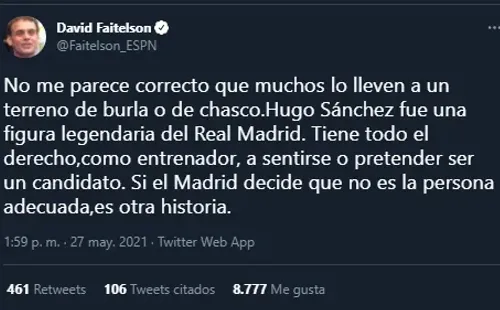 “No me parece correcto que muchos lo lleven a un terreno de burla o de chasco. Hugo Sánchez fue una figura legendaria del Real Madrid. Tiene todo el derecho, como entrenador, a sentirse o pretender ser un candidato. Si el Madrid decide que no es la persona adecuada, es otra historia”,comentó David Faitelson en sus redes sociales. Recordemos que Fernando Palomo había hecho una respuesta, solo que totalmente opuesta, criticando la “postulación” de Hugo al Madrid.