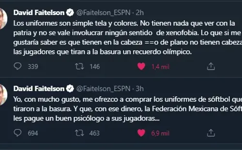 A través de las redes sociales el periodista mexicano David Faitelson no quiso mantenerse alejado de esta polémica. “Los uniformes son simple tela y colores. No tienen nada que ver con la patria y no se vale involucrar ningún sentido de xenofobia. Lo que si me gustaría saber es que tienen en la cabeza ==o de plano no tienen cabeza== las jugadores que tiran a la basura un recuerdo olímpico”, comentó David Faitelson.