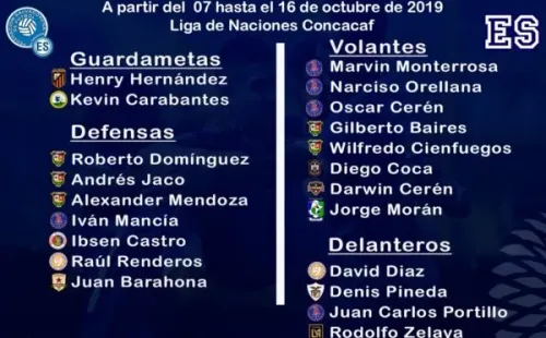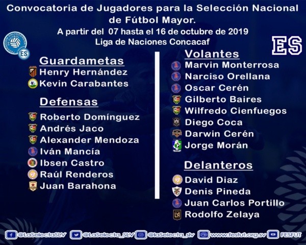 La selección nacional de El Salvador afrontará la próxima con algunas novedades en la lista; se destacan las caras nuevas del defensor Néstor Raúl Renderos (Metapán), Jorge Morán (Sonsonate),Ibsen Castro (FAS), y Wilfredo Cienfuegos (Santa Tecla).