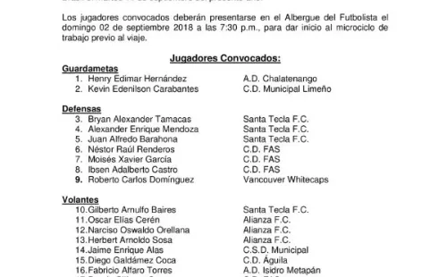 El mexicano Carlos de los Cobos, seleccionador de El Salvador, presentó el viernes una convocatoria repleta de jugadores del torneo doméstico, además de tres legionarios que se reportarán en Washington para el partido amistoso contra Brasil.