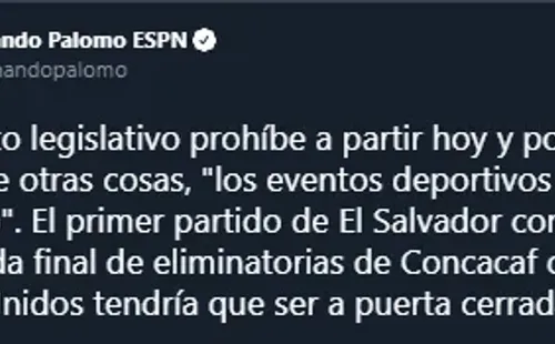Del mismo modo, el periodista salvadoreño Fernando Palomo, apuntó a que debido a esta situación, la Selección de manera oficial no jugará desde El Salvador, a menos no lo hará con público. “Un decreto legislativo prohíbe a partir hoy y por 90 días, entre otras cosas, “los eventos deportivos abiertos al público”. El primer partido de El Salvador como local en la ronda final de eliminatorias de Concacaf contra Estados Unidos tendría que ser a puerta cerrada”, escribió el periodista salvadoreño en su cuenta de Twitter.