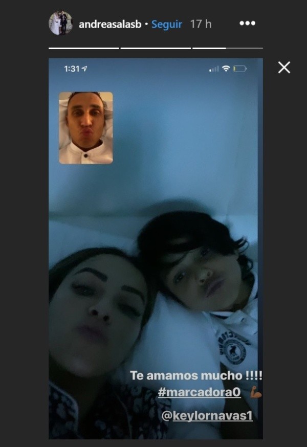 La evidencia de la videollamada fue compartida por Andrea Salas en su cuenta de Instagram. Allí aparecen ella y su hijo mayor en primer plano enviando un beso a la pantalla, mientras en un pequeño recuadro el guardameta hacía lo mismo.