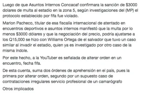 La información que circula por redes sociales menciona no solo la supuesta multa de 3 mil dólares que Concacaf le impondría a la federación guatemalteca, sino de dos órdenes de aprehensión que tendría en su contra la mujer por alteración del orden público y por la contratación irregular del camarógrafo que grabó toda su hazaña.