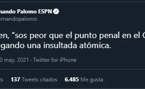 A través de sus redes sociales, el periodista salvadoreño, Fernando Palomo envió un mensaje haciendo foco al mal estado de la cancha, pero sobre todo al punto penal. Que era donde estaba en juego todo el torneo. Desde allí los jugadores de ambos equipos ejecutaros sus cobros a lo que Palomo respondió. “Si te dicen, “sos peor que el punto penal en el Cusca” te están pegando una insultada atómica”,sentenció el periodista salvadoreño.