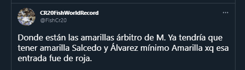 A través de su cuenta oficial de Twitter, Carlos Ruiz estuvo siguiendo minuto a minuto el partido, y cuando desde su perspectiva el árbitro no tomaba buenas decisiones, se lo hacía saber de manera contundente, aunque de manera agresiva. “Donde están las amarillas árbitro de M. Ya tendría que tener amarilla Salcedo y Álvarez mínimo Amarilla xq esa entrada fue de roja”, expuso El Pescadito Ruiz reclamándole otras decisiones al principal.