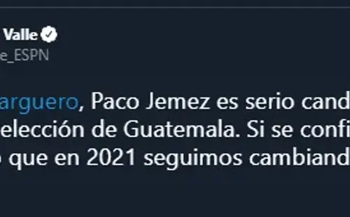 A través de su cuenta oficial de Twitter, el periodista José del Valle escribió lo siguiente: “Según @Ellarguero, Paco Jémez es serio candidato para dirigir a la Selección de Guatemala.Si se confirma, me queda claro que en 2021 seguimos cambiando espejos por oro”, comentó el periodista del Valle.Recordemos que en la trayectoria dePaco Jémezcomo entrenador, ha dirigido los clubes de:UD Las Palmas,Rayo VallecanoyGranadade España. Además, estuvo en el banquillo deCruz Azuldurante la temporada 2016-2017.