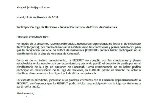 La Federación de Fútbol Guatemalteca (Fedefut) estaba suspendida desde 2016 por la FIFAde toda competición internacional y por ese motivo fue descartada por la Concacaf para la fase previa de la Liga de Naciones, que disputan 34 naciones tras una primera jornada en agosto.