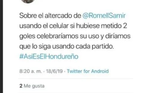 Sin saberse por qué, el atacante borró el trino; no obstante, lanzó algunas indirectas a través de Instagram que irían dirigidas a sus críticos. En una de ellas replicó un mensaje de otra persona que dijo que “Sobre el altercado de @RomellSamir usando el celular, si hubiese metido 2 goles celebraríamos su uso y diríamos que lo siga usando cada partido #AsíEsElHondureño”.